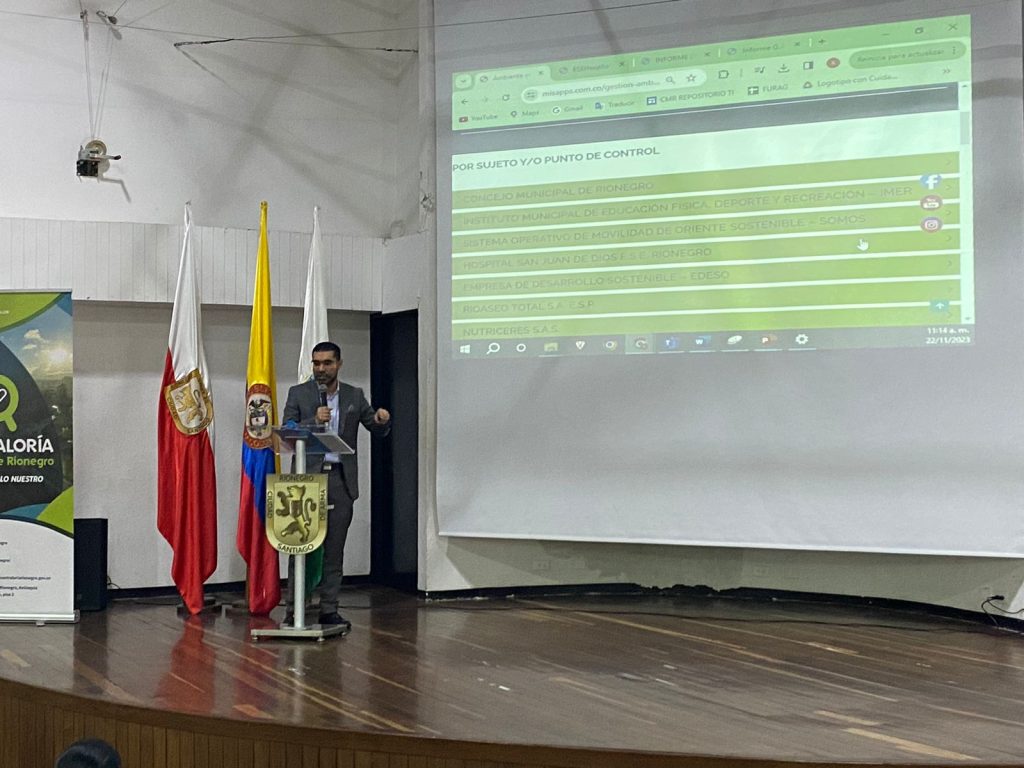En el evento de lanzamiento del 🔎🌱 Observatorio de Control Fiscal Ambiental (OCFA) de la Contraloría Municipal de Rionegro, el Contralor Municipal de Rionegro @rodrigo_montoya presentó las generalidades de este sistema que recolecta, organiza, interpreta y divulga información útil para la toma de decisiones en materia de política pública y para la construcción de conocimiento sobre la situación de los recursos naturales y del medio ambiente en el municipio de Rionegro.